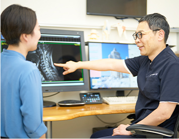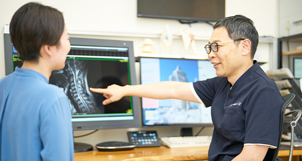 診察では、体の痛みやしびれなどの症状はもちろん、事故の状況や衝撃の強さ・方向なども丁寧にお伺いします。必要な検査を行ったうえで、医師がしっかりと診断し、治療方針についてわかりやすくご説明いたします。ご不安なことがあれば、どんな小さなことでもお気軽にご相談ください。